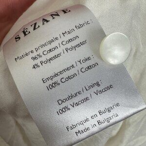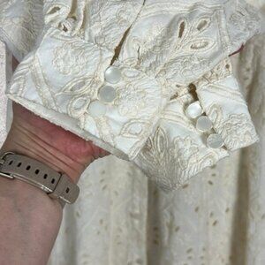 Sézane Bella Dress in Ecru Embroidery and Women's Size 40 French or US 8. Maxi length. Long sleeves. Collared. Full embroidered long dress with a shirt collar and skirt with ample volume. Tie belt at the waist. Lined. Heavy weight. 96% cotton and 4% poly. Yoke is cotton. Lining is viscose. Made in Bulgaria. Machine washable. Great pre-owned condition. Extra button attached to care tag. Please review all photos.