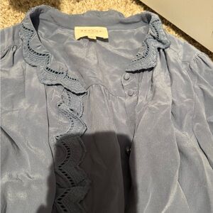 Elegant blue button down shirt. Features scalloped collar. Long sleeves with button cuffs.