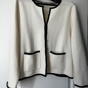 100% merino wool cardigan, hook and eye closure, excellent condition; link to the Sezane listing https://www.sezane.com/us-en/product/brielle-cardigan/ecru-black#size-XXXL. Please note this items runs small