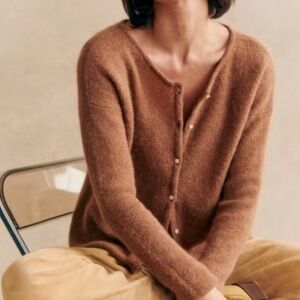 Cozy brown cardigan. Button-up front. Soft knit texture. Perfect for layering.