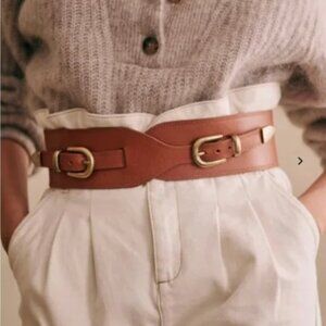 Elegant brown leather belt. Features dual buckle design. Perfect for adding style.