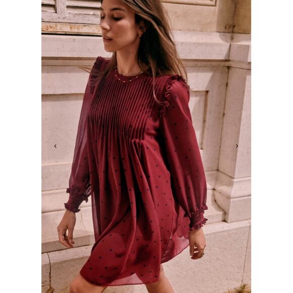 Chic burgundy mini dress by Sezane. Features black polka dots and pleated front. Long sleeves with ruffle details.