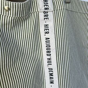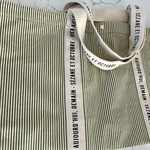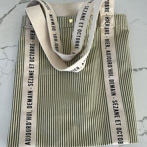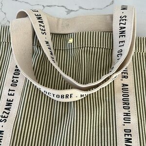 Sezane Cabas Libre Service Weekender Large Tote Green Stripe Cream 100% Cotton