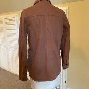 Stylish brown jean jacket. Features button closure. Classic collar design. Perfect for layering.