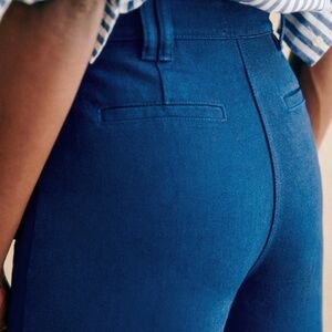 These Sezane trousers feature a high-waisted design with a wide-leg silhouette that flares from the knee down. Crafted in a rich blue hue, they offer a structured fit through the hips and thighs, embodying a classic 70s style. Perfect for a polished yet casual look.