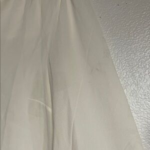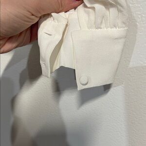 Light cream blouse with delicate ruffle trim. Soft long sleeves and button front. Feminine and versatile styling. Pairs well with jeans or skirts.