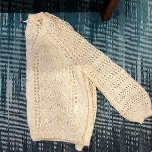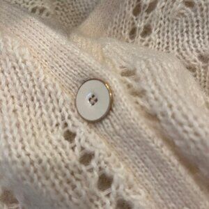 Sezane Dereck Cardigan/Jumper. Ecru color, Size S. Slightly oversize fit, I am a US 6 on top and it fits me well. Worn no more than 3 times, and had been stored lightly folded in my closet otherwise. Airy yet warm due to the Mohair. Enamel buttons. No rips/stains/tears.