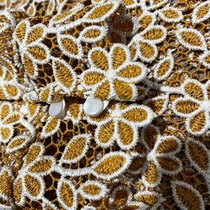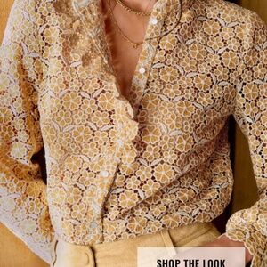 This lace blouse in gorgeous golden color is sold out on Suzanne's website, Composition: Main Fabric : 100% Recycled polyester