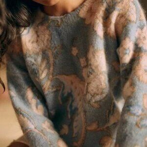 Cozy knit sweater with a floral pattern. Features a blend of blue and cream colors.