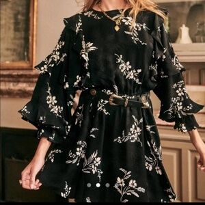 Sezane Lali Floral Ruffle Mini Dress Two Toned Jacquard Black Size 36 US 4