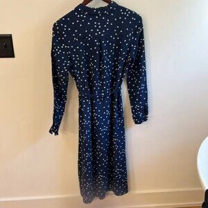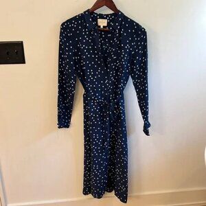 A beautiful silk shirt dress by Sezane in a dainty daisy jacquard that has a fabric belt that could be perfect for a spring walk or a warm summer.