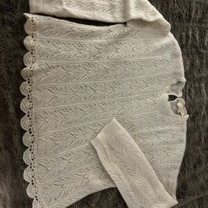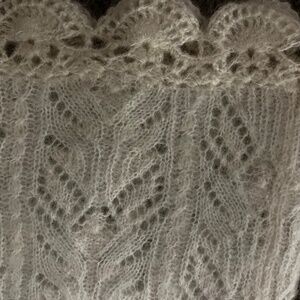 Lightweight mohair blend jumper with scalloped edge on the bottom and neckline, button closure at the back with one button. Great condition.