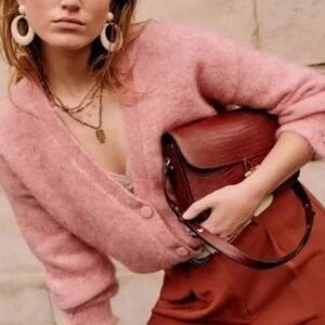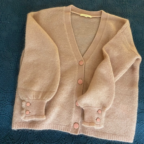 Sezane Mia Cardigan (XS) Soft Pink. In "Like New' condition. No odors, fragrance, stains or tears. Clean, as new condition. This over-size fitted cardigan has pink enameled buttons, not plastic/resin as seen in the stock photos. Color is soft pink. Lighting is not showing accurate color representation in some photos.