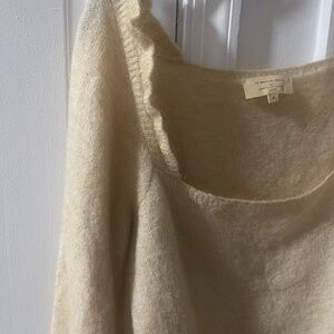 Kid mohair and merino wool jumper with long balloon sleeves, square neckline, ruffled pleats on the shoulders. Creamy light butter color with light yellow tinge.