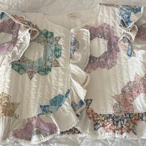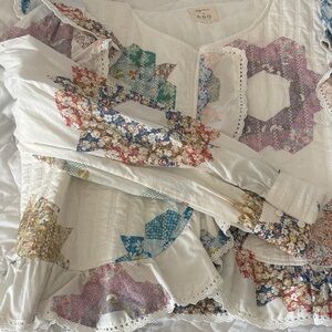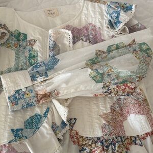 Chic Sezane top with floral patterns. Features ruffle details and long sleeves. Perfect for a stylish look.