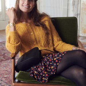 Cozy knit cardigan by Sezane. Features a vibrant mustard yellow color. Perfect for layering.