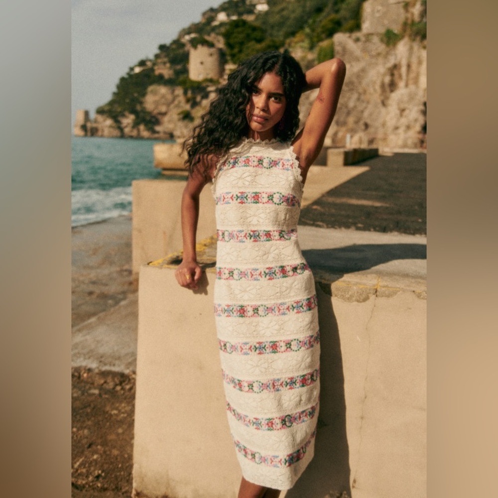 Elegant floral lace midi dress perfect for any occasion. Features a beautiful cream color with intricate floral patterns. Ideal for adding a touch of sophistication to your wardrobe.