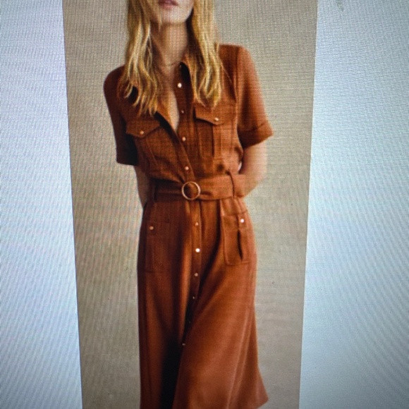 Short-sleeve midi dress with a shirt collar,button placket, waist belt, and front patch pockets.