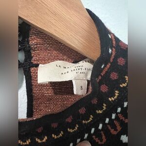 Elegant black sweater with intricate red patterns. Features long sleeves and detailed design.
