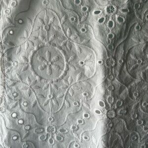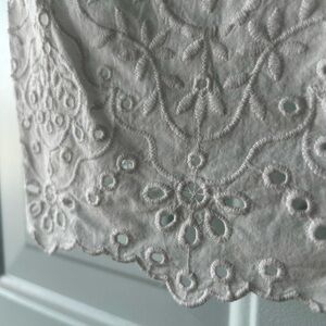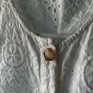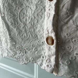 This elegant white eyelet button-down sleeveless top is perfect for any occasion. Its intricate design adds a touch of sophistication to your wardrobe.