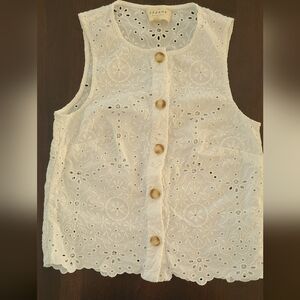 Sleeveless eyelet top with a round neckline. Decorative button-front closure. Lightweight and breathable for warm days. Feminine embroidery detail throughout. Excellent