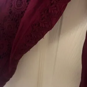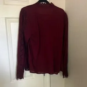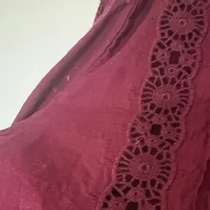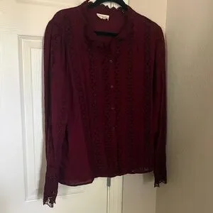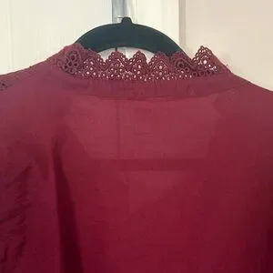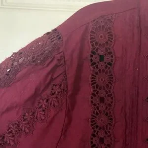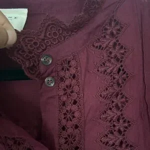 Elegant plum lace-trim blouse with delicate pintuck and crochet details. Features a scalloped lace neckline and button-front closure for a polished look. Soft, rich plum color pairs beautifully with tailored or casual outfits.