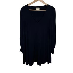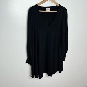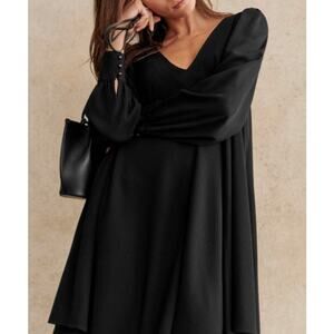 Elegant black mini dress. Features long sleeves and a V-neckline. Perfect for any occasion.