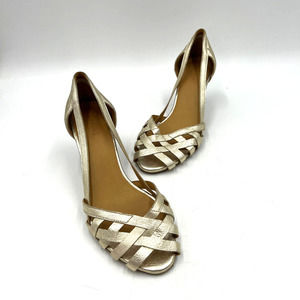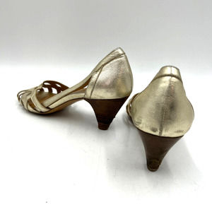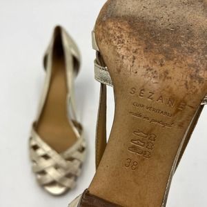 Sezane Strappy Gold Low Heels Peep Toe Court Shoe Sandals