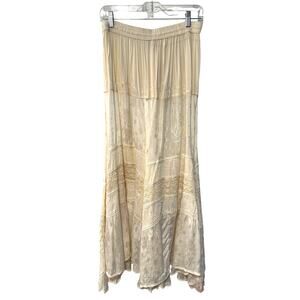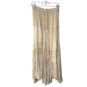 Add timeless bohemian elegance to your wardrobe with this gorgeous vintage cream maxi skirt from sezane vintage. Crafted from soft, flowing 100% rayon with intricate tonal embroidery and lace panel detailing, this skirt drapes beautifully for an effortlessly romantic silhouette. The elastic waist with tasseled drawstring offers comfort and adjustability, making it perfect for casual outings, fall layering, or festival styling.