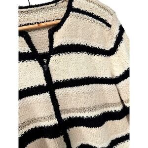 Timeless silk and cotton blend knit cardigan jacket featuring bold black and cream horizontal stripes from sezane vintage. The textured knit and classic button-front design make this a versatile piece that can be styled casually with jeans or dressed up for work.