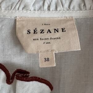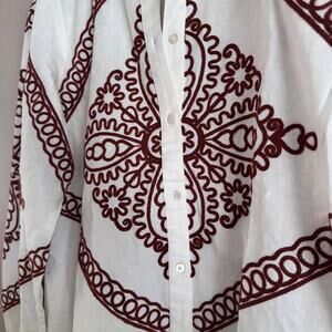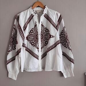 Sezane White and Brown Embroidered Megane Long Sleeve Shirt Ecru Blouse 38 6
