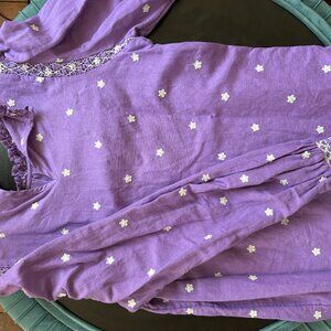 Long sleeve blouse in beautiful linen fabric. Lilac color and white flowers embroidery. Not available on Sezane website anymore. New without tag. I am a size 2 (and 5ft3) and it fits slightly large. Recommended for a taller size 2 or a size 4.