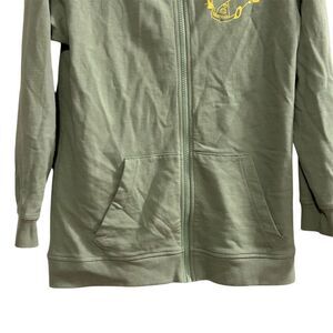 This Sfera full zip hoodie is designed for unisex kids and comes in a vibrant green color. It features a graphic pattern with characters like a vintage van and palm tree, embodying themes of adventure and travel. Made from a blend of cotton and polyester, it offers a regular fit with long sleeves and a crew neckline. The hoodie includes front pockets and a comfortable hood, suitable for all seasons including fall, spring, summer, and winter. It is machine washable and ideal for casual occasions. The size is 11/12. This pre-owned item is in excellent condition.