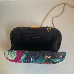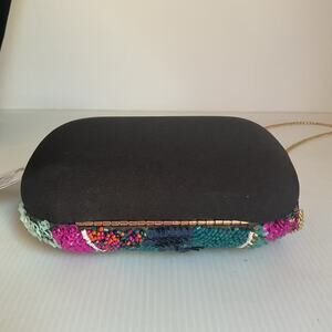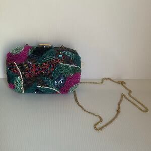 Elegant Sfera evening clutch, made in Spain, with colorful beaded and sequin floral design. Features a gold-tone chain strap, black fabric back, and snap closure. Perfect for weddings, parties, or special events.