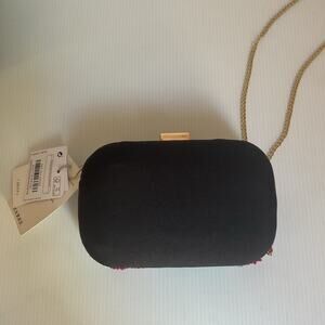 Elegante bolso clutch de Sfera, hecho en España, con diseño floral de chaquira y lentejuelas multicolor. Incluye cadena dorada, parte trasera de tela negra y cierre de broche. Ideal para bodas, fiestas y eventos especiales.