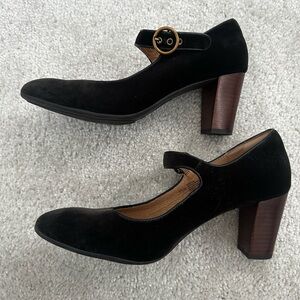 Söfft high heels. Upper lining is leather. External material is velvet. Dark olive green color with brown heel and copper buckle. Perfect fall heels! Heel is 3” tall. Size 9.5.