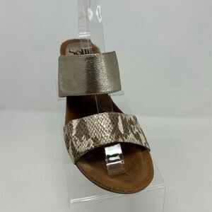 Keywords: Söfft sandals, women's wedge sandals, gold leather sandals, snake print sandals, strap sandals, hook & loop closure, mid heel sandals, pre-owned women's shoes, size 7M sandals, comfortable wedge sandals, stylish summer footwear, leather upper sandals, women's fashion sandals, trendy gold wedges
