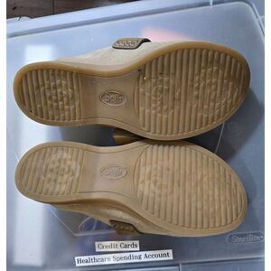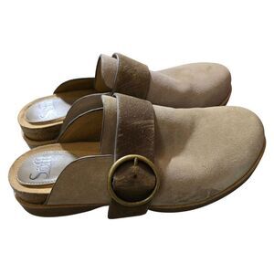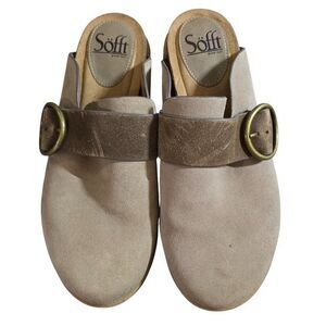 Söfft Womens 7.5M Beige Suede Leather Clogs With Brown Straps & Brass Buckles