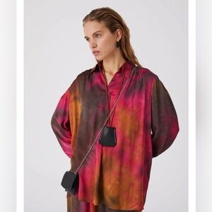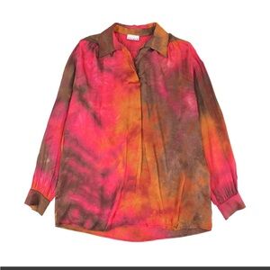 Vibrant tie-dye blouse with long sleeves. Features a blend of red, orange, and brown hues.