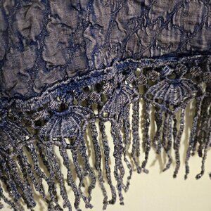 Sfizio Made In Italy Unique Mixed Media Blue Tan Stretch Fringe Tank Top Size M. Pit to pit 21", shoulder to hem 23" to end of fringe, Crochet Lace Detail, V Neck, Neutral, Very Unique Piece. Good Pre-Owned Condition