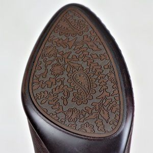 Söft shoe design for an all-over comfortable fit, slip-on pumps featuring a butterfly-knot bow detail, two-tone brown leather suede uppers, Söft System® full-length high padded cushioned footbed insoles for ultimate cushioning support, soft leather inner-lining panels, Almond-toe shaped, 2” block heel, durable synthetic traction sole.