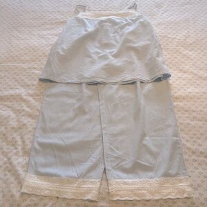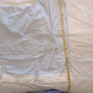 Comfortable Shabby Chic blue and white striped pajama set featuring delicate lace trim. Perfect for a cozy night in. Cropped drawstring pants and top has adjustable straps. 100% Cotton.