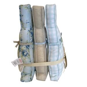 One pillow is blue with roses, the other a light beige linen color and the last is a blue plaid/checkered pattern.