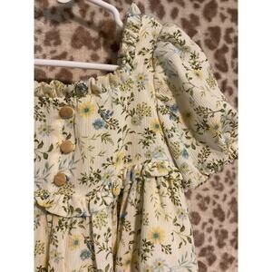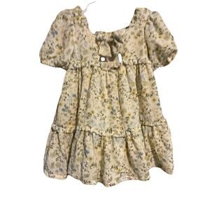 This shabby chic floral dress in size 2T for girls features a round neckline, button closure, and ruffle accents. The knee-length dress is designed in a cream color, making it perfect for summer and spring occasions like parties or casual wear. With a vintage-inspired feel and a brand like CHIC, this A-line dress offers a charming and stylish look for little girls. Easy to care for with its machine washable garment care instructions, this dress is a lovely addition to any young girl's wardrobe.