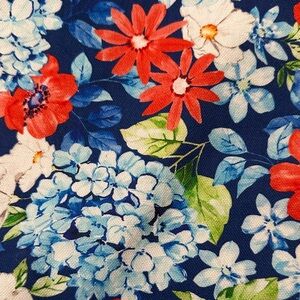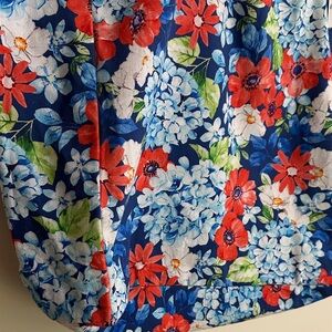 Vibrant floral design with blue, red, and white flowers. Bold red handles for a striking look.