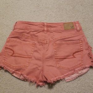 American Eagle dark coral/ rust colored stretch denim high rise shorts with lace and fraying detailing for a shabby chic aesthetic. It has REAL POCKETS, front and back! Super comfortable, no tears, stains, or signs on wear on the seams or zipper.