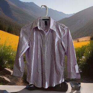 This product is a women's pink striped button-down shirt by Lauren Ralph Lauren in size PP. The shirt features a button front closure and is made of 100% cotton. With a classic 3/4 sleeve and a white-pink striped pattern, this shirt is a versatile and stylish addition to any wardrobe. Perfect for all seasons, this shirt can be dressed up or down with ease for any occasion.