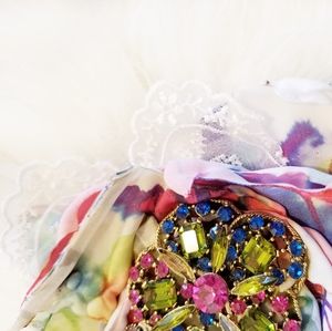 Multi colored Fabric pin adorned with vintage pins clustered in center. Cute on a cardigan or coat. Even pin it on a scarf wrapped around your neck.