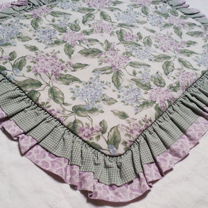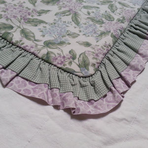 JC Penney Home Collection Shabby Chic Cottage Style Euro Pillow Sham with double ruffle and purple and blue lilacs. The double ruffled edge has coordinating fabrics in a white and green check and lavender and white diamond design. It is 100% cotton. It measures 33" by 28" and the envelope in the back for the pillow measures 21" by 26".
