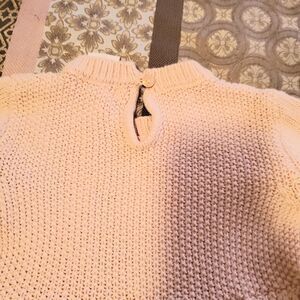 Beautiful soft pink rose full knitted dress. Cable knit and flower design detail on top front. Button detail closure on back. Size says it's a 5T, but in my opinion it runs a little small. Please refer to measurements for best fit. *black area on pictures 2 &4 is just my phone shadow.